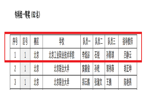 由林碩蕾老師指導,機電1771班秦漢起、造價1772班紀子豪、網絡2032班張逸冰3名同學組成的團隊榮獲北京市一等獎;