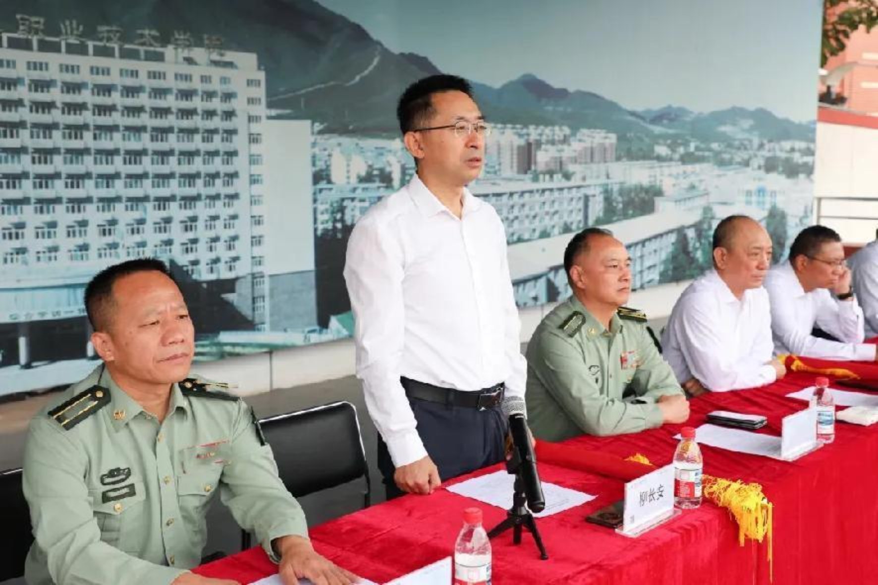 柳長安向石景山區人武部贈旗,對其長期以來在學校軍訓組織、征兵工作指導等方面的大力支持表達誠摯敬意!魏曉東代表學校向承訓部隊贈送錦旗,感謝教官們以專業的軍事指導、嚴謹的作風態度,為新生錘煉意志、塑造品格。