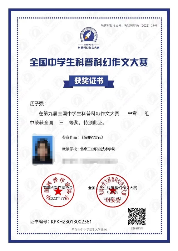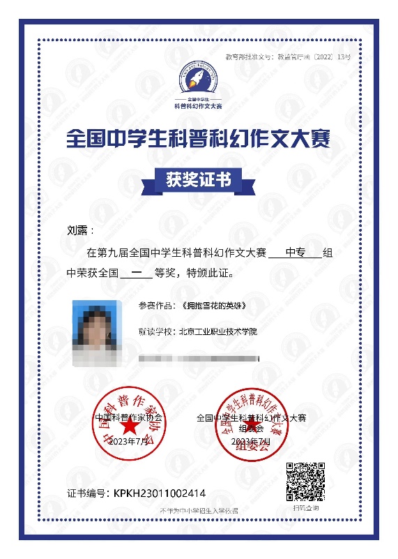 劉露同學(xué)的作品《擁抱雪花的英雄》在葛東雷老師指導(dǎo)下榮獲中國(guó)科普作家協(xié)會(huì)主辦的全國(guó)中學(xué)生科普科幻作文大賽全國(guó)一等獎(jiǎng);歷子強(qiáng)榮獲全國(guó)三等獎(jiǎng)。