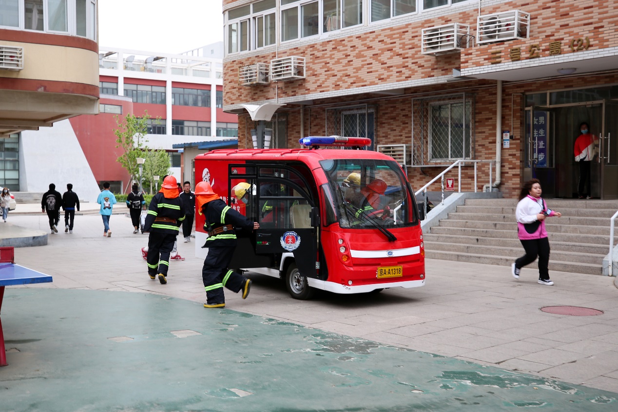 開幕式組織了學校微型消防站拉動訓練。拉練模擬2號公寓東段三層西向某間宿舍有火情,學校“平安校園”聯動管理中心接到報警后,立即通知學校“微型消防站”前往處置。“微型消防站”接到通知后,馬上穿戴好防護服,帶裝備駕駛“微型消防車”前往。到達現場后,隊員分兩路進行處置,一路迅速進到樓內處置,一路利用消防車出水滅火。