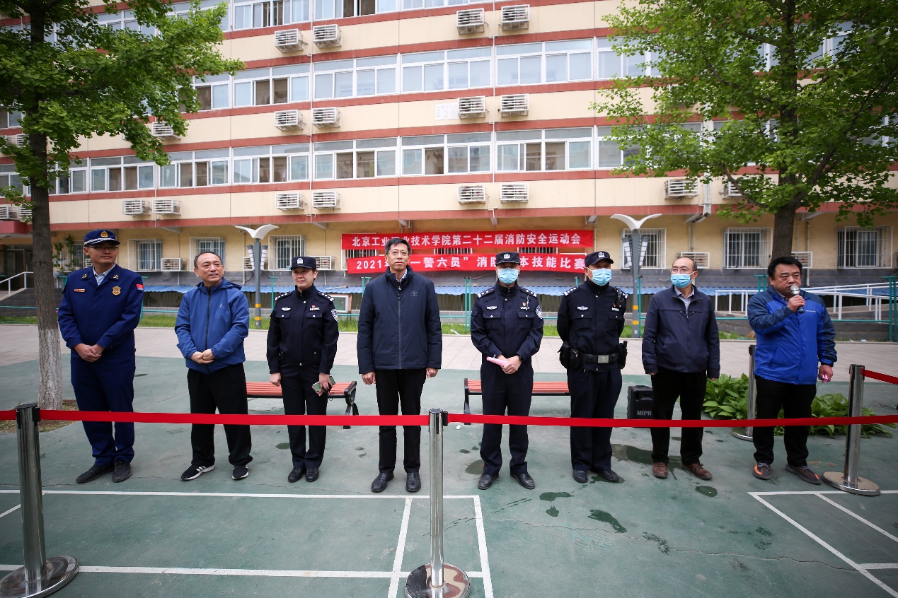 我校第二十二屆消防安全運動會暨2021年“一警六員”消防基本技能比賽4月30日上午在學生公寓廣場舉行。校黨委書記、學校安全穩定工作領導小組組長高喜軍,校黨委副書記、學校安全穩定工作領導小組副組長魏曉東,石景山區公安分局五里坨派出所副所長馬志、石景山區消防救援支隊蘋果園大隊消防監督員張凱等出席了開幕式并觀摩指導比賽。