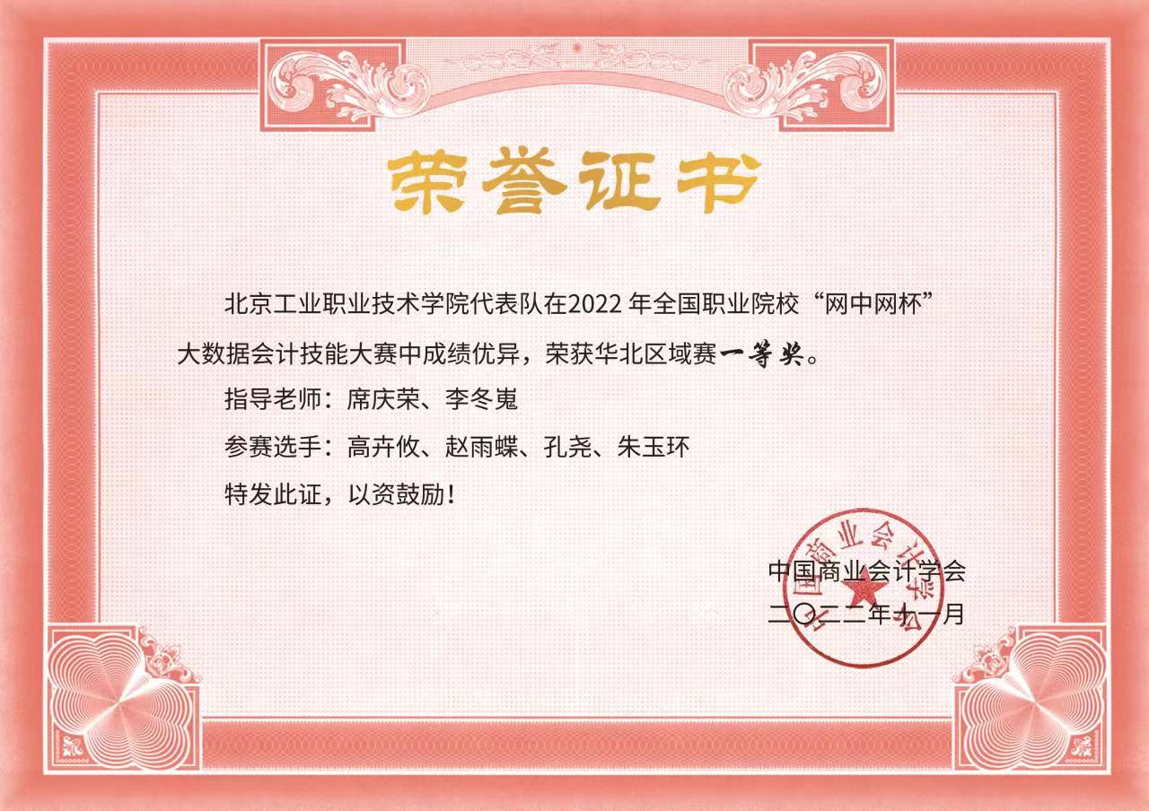 2022年11月26日-27日,全國職業院校“網中網杯”大數據會計技能大賽如期在線上舉行,大賽由中國商業會計學會主辦的、全國近200所院校參加。文法與管理學院席慶榮、李冬嵬兩位老師帶領大數據與會計專業2131班高卉攸、趙雨蝶、孔堯、朱玉環4名學生參加比賽。經過激烈角逐,最終榮獲華北區域賽一等獎的好成績。