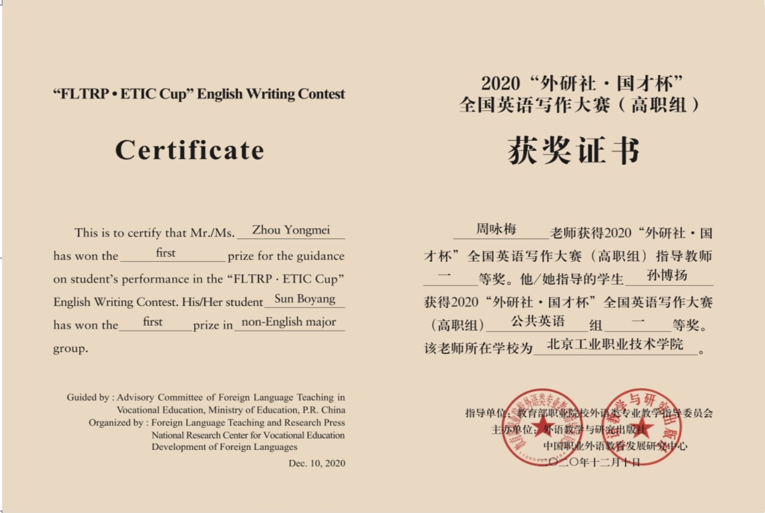 2020年12月10日,“外研社.國才杯”全國英語寫作大賽(高職組)成績出爐,來自全國28個省、市、自治區(qū)的122名選手參加競技,決出一等獎10名,二等獎30名,三等獎82名。我校機電1831班的孫博揚同學代表北京市參加了此次大賽,獲得一等獎,指導教師周詠梅老師獲得指導教師一等獎,實現(xiàn)了我校在該賽項上一等獎零的突破!
