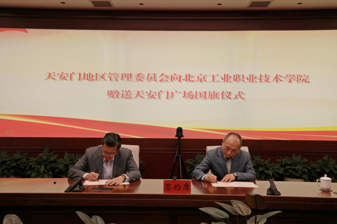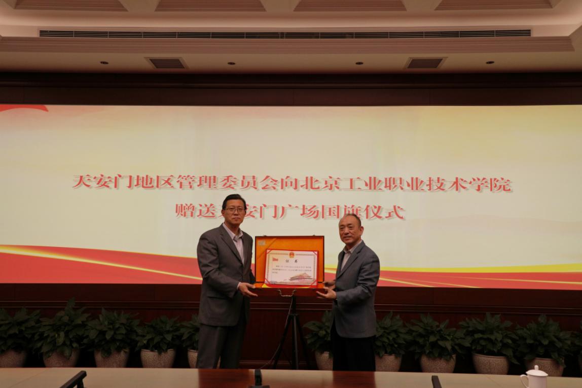 12月13日,北京市人民政府天安門地區管理委員會向我校贈予國旗儀式在京舉行。天安門地區管理委員會黨組成員、副主任姚輝向學校贈予國旗,我校黨委副書記魏曉東代表學校接受國旗。