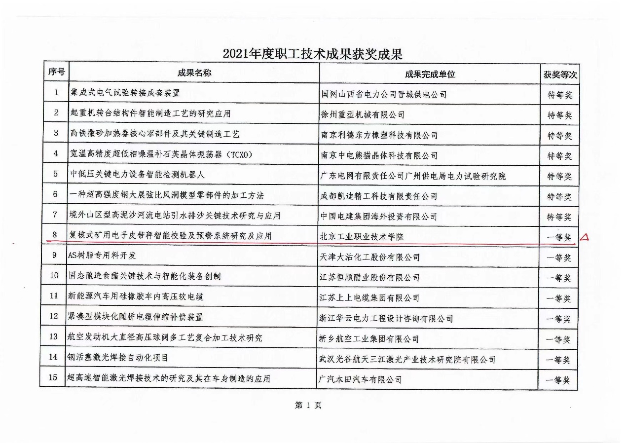 近日,中國職工技術協會發文《關于2021年度職工技術成果評選結果的通報》(中國技協發〔2022〕18號),我校研制的“復核式礦用電子皮帶秤智能校驗及預警系統研究及應用”科研成果轉化項目獲得了中國職工技術協會2021年度職工技術創新成果一等獎。