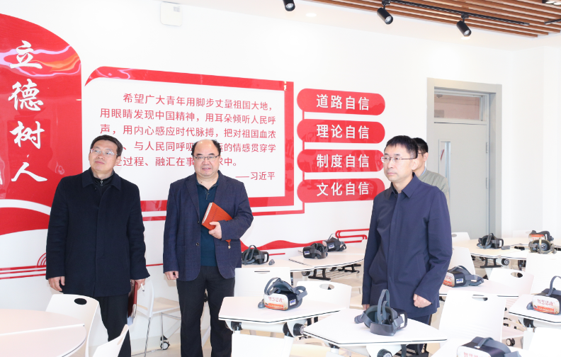 柳長安察看了馬克思主義學院思政課虛擬仿真體驗教學中心、教學(行政)辦公室、教研室,現場體驗了思政課虛擬仿真課程資源,詳細了解馬院辦公場所布局和教學條件建設。