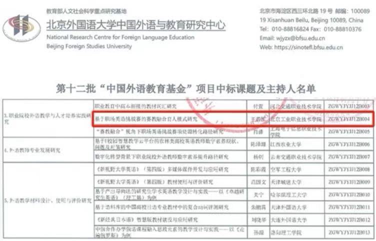 第十二批“中國外語教育基金”項目由教育部人文社科重點研究基地北京外國語大學中國外語與教育研究中心、教育部高等學校大學外語教學指導委員會、教育部高等學校外國語言文學類專業教學指導委員會和外語教學與研究出版社共同主持,面向全國公開進行課題招標,旨在服務教育強國建設,推動我國外語教育改革與發展,提高外語教師專業水平與學術創新能力。本次申報與來自全國的本科院校競爭申報,通過率僅為28.5%,我校是北京市唯一中標高職學校,體現了我校在“賽教融合育人模式”以及外語教育改革與發展方面的實力與成就。