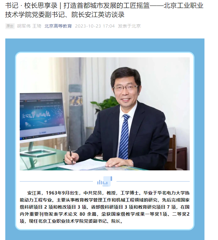 近日,《北京高等教育》以“打造首都城市發展的工匠搖籃——北京工業職業技術學院黨委副書記、院長安江英訪談錄”為題刊登了該報對安江英院長的專訪。采訪中,安院長介紹了“雙高”建設給職業教育帶來的變化,并分享了我校“雙高”建設成果、辦學經驗,育人模式和學生發展前景。現將全文轉載如下: