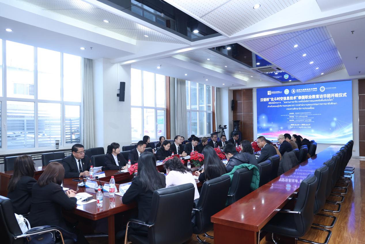11月14日,漢語橋“北斗時空信息技術”泰國職業教育訪華團開班儀式在北京工業職業技術學院匠心樓第四會議室舉行。泰國職業教育委員會副秘書長納儂猜·扎叻盧吉薩率16人代表團出席。時值泰國國王哇集拉隆功對中國進行國事訪問之際,本次活動成為兩國友好關系框架下人文交流與職業教育合作的重要實踐。
