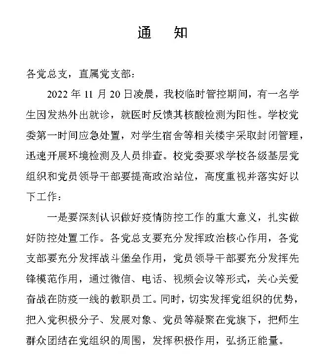 一直以來,疫情防控就是學校頭等重要的工作,在上級部門的堅強領導下,在屬地衛健、疾控等部門的指導下,學校制定了周密的應急預案。連日來,學校疫情防控領導小組每日召開疫情防控調度會,統籌安排臨時管控期間同學們的大事小情。校黨委組織部發出號召,要求各黨總支、黨支部和黨員干部要充分發揮政治核心、戰斗堡壘和先鋒模范作用。