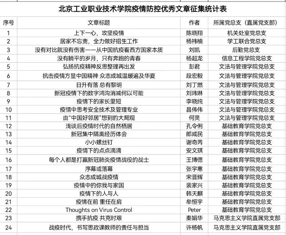 此次活動,共收到7個黨總支(直屬黨支部)24名師生24篇優(yōu)秀文章(具體名單見下表),其中基礎(chǔ)教育學(xué)院黨總支11篇,文法與管理學(xué)院黨總支7篇,馬克思主義學(xué)院直屬黨支部2篇,機(jī)關(guān)處室黨總支、學(xué)工聯(lián)合黨總支、后勤黨總支、信息工程學(xué)院黨總支各1篇。內(nèi)容涉及“中西方抗疫的本質(zhì)對比”“抗疫精神的弘揚(yáng)與反思”“思政課教師的責(zé)任與擔(dān)當(dāng)”“疫情中的家國情懷”“疫情中的無私奉獻(xiàn)”“疫情下的日常工作”“疫情下的家長里短”“后疫情時代的自然棲居”“新冠疫情下的數(shù)字鴻溝消減”等諸多方面。值得一提的是,基礎(chǔ)教育學(xué)院外籍教師Peter Almeda,根據(jù)自身的經(jīng)歷,高度贊揚(yáng)了中國行之有效的防疫政策,并表示:“我很有信心,我們定會成功,因?yàn)槲覀儓F(tuán)結(jié)一致、抗疫到底、戰(zhàn)無不勝。”經(jīng)過專家評委的評審,擇優(yōu)推薦了13篇至市委教育工委。學(xué)校官方微信將對其中部分優(yōu)秀文章分期予以發(fā)布。推薦至市委教育工委的文章,如被其錄用,也將會在其相關(guān)宣傳平臺予以刊登。