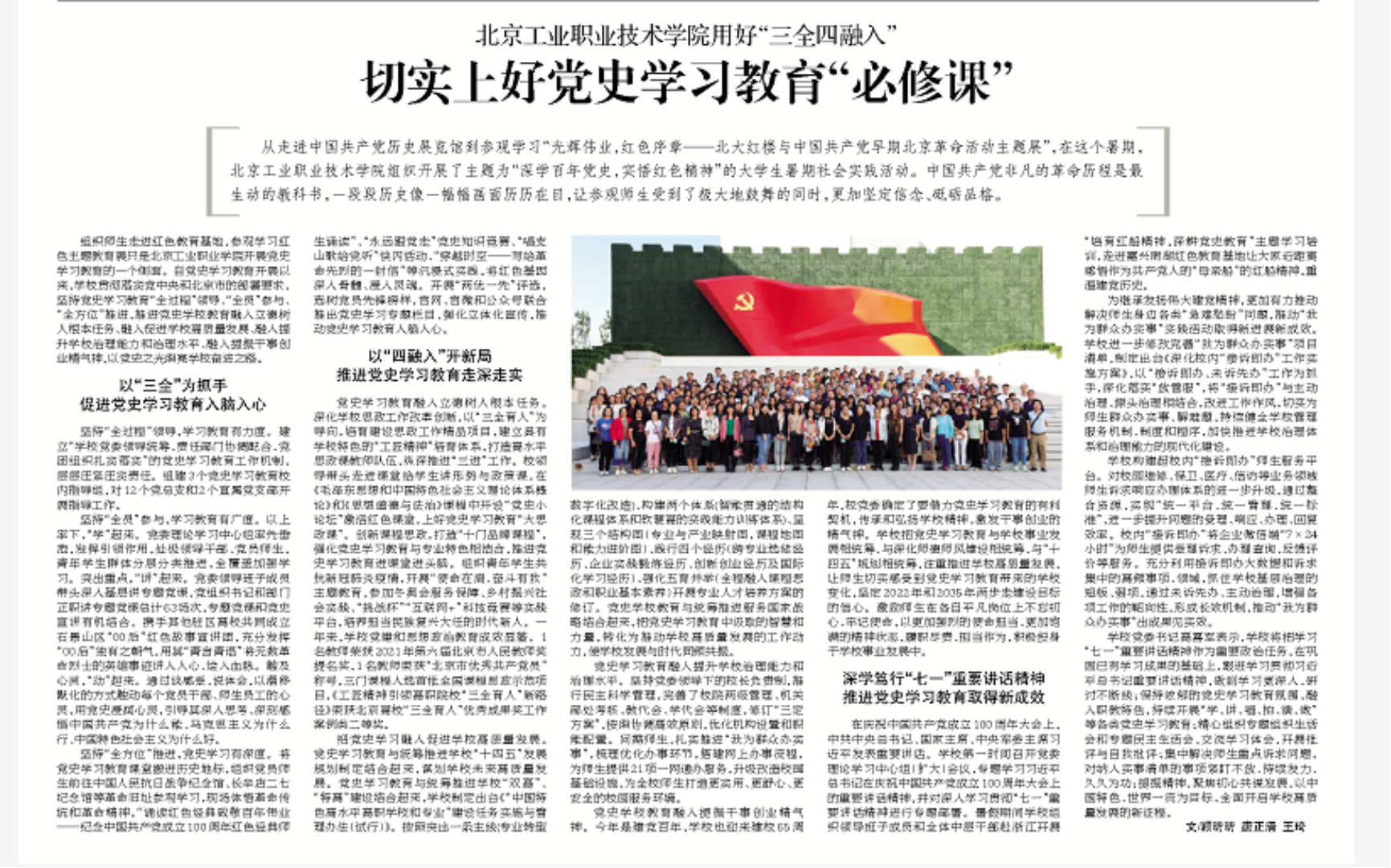 10月18日,《北京日報》刊登文章《北京工業(yè)職業(yè)技術(shù)學院用好“三全四融入”切實上好黨史學習教育“必修課”》,詳細介紹我校黨史學習教育開展情況,深入報道校黨委在黨史學習教育中不斷提高教育效果的重要經(jīng)驗。