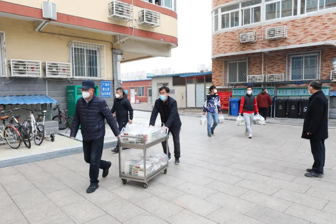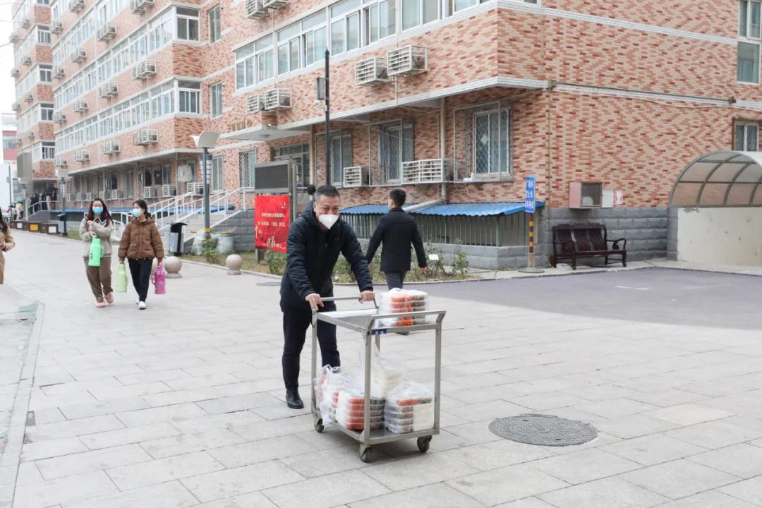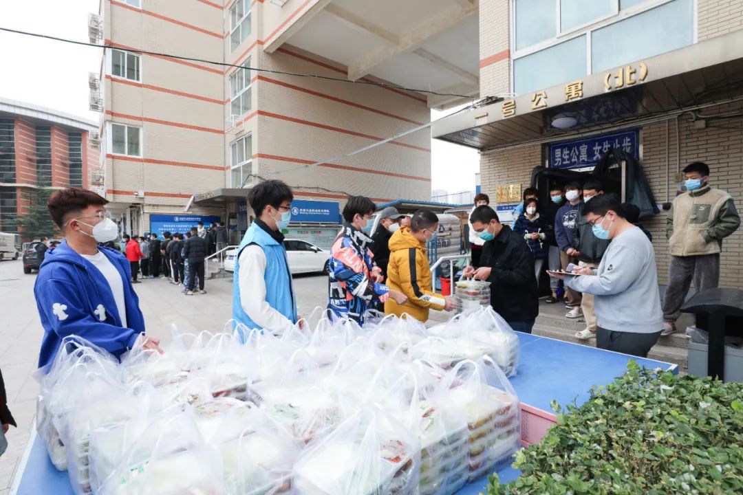 中午12時,4棟學生公寓樓共設置7個分餐點,黨員領導干部帶頭前往學生公寓,為同學們送餐分餐。