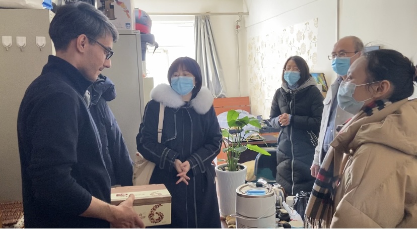 隨后,國際處老師們前往外籍教師公寓,先后探望慰問了外教Peter和Simi。國際處副處長孟晴親切詢問了外教的日常生活、工作情況,詳細了解兩名外籍教師在生活中、工作等方面有無困難,并將學校疫情防控要求耐心細致的傳達給兩名外籍教師。兩名外教倍感溫暖,分別表達了對學校真摯的感謝。兩名外教表示對中國文化充滿了熱愛,很開心能在北京度過如此難忘又溫暖的中國春節。春節期間外教會和國際學生一同結伴過年,共同烹飪年夜飯、貼春聯等,國際處老師們代表學校向兩名外籍教師致以新春的問候,并祝愿他們有一個平安快樂的假期。