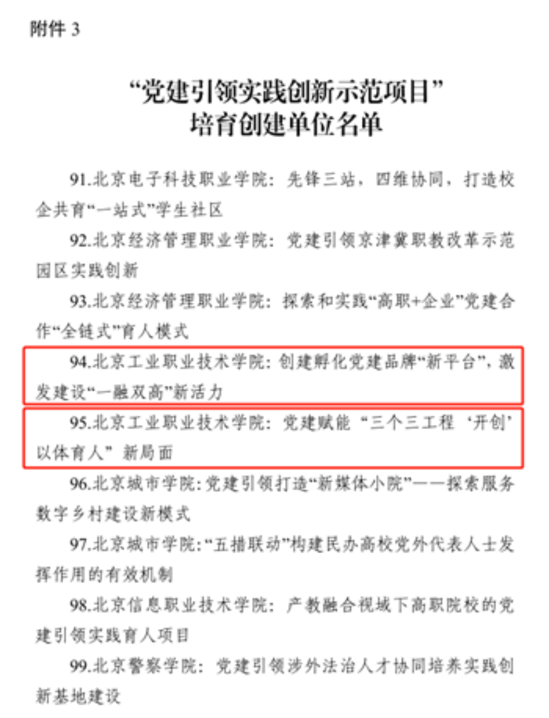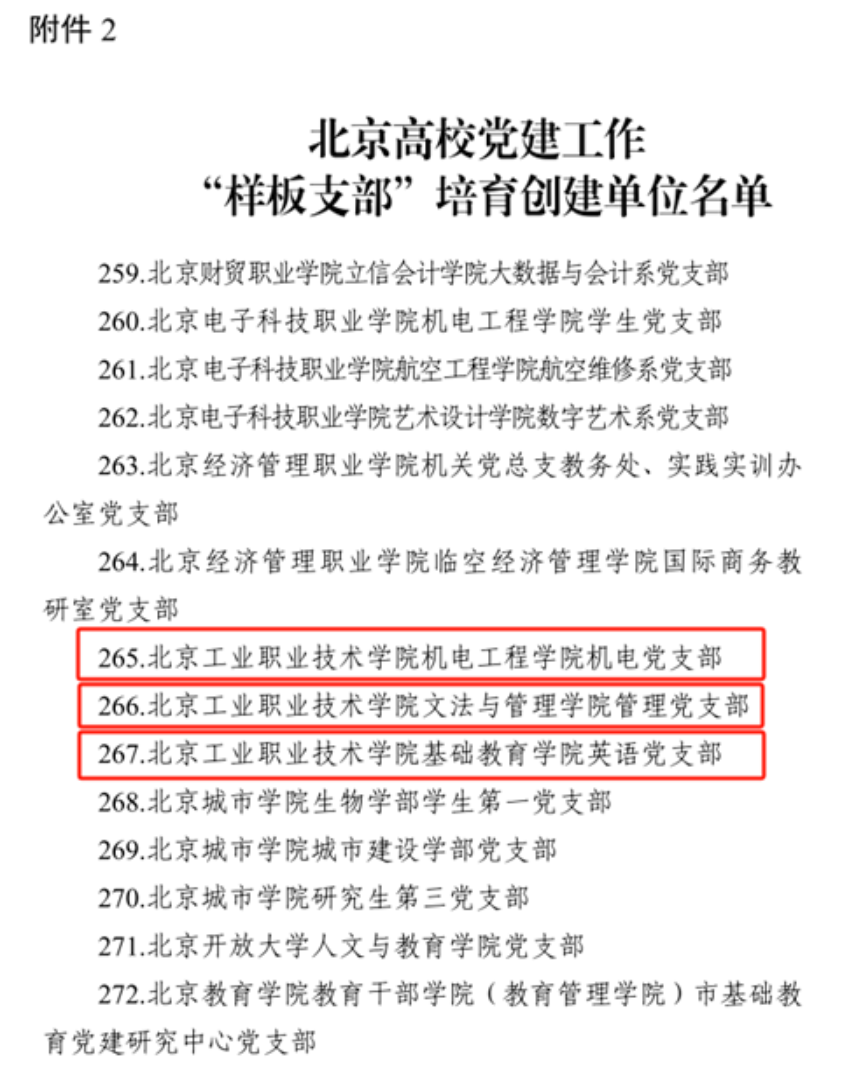 我校機電工程學院獲評北京高校黨建工作“標桿院系”培育創(chuàng)建單位,機電工程學院機電黨支部、文法與管理學院管理黨支部、基礎教育學院英語黨支部等3個支部獲評北京高校黨建工作“樣板支部”培育創(chuàng)建單位,“創(chuàng)建孵化黨建品牌‘新平臺’,激發(fā)建設‘一融雙高’新活力”、“黨建賦能‘三個三工程’,開創(chuàng)‘以體育人’新局面”等2個項目獲評北京高校黨建工作“黨建引領實踐創(chuàng)新示范項目”。