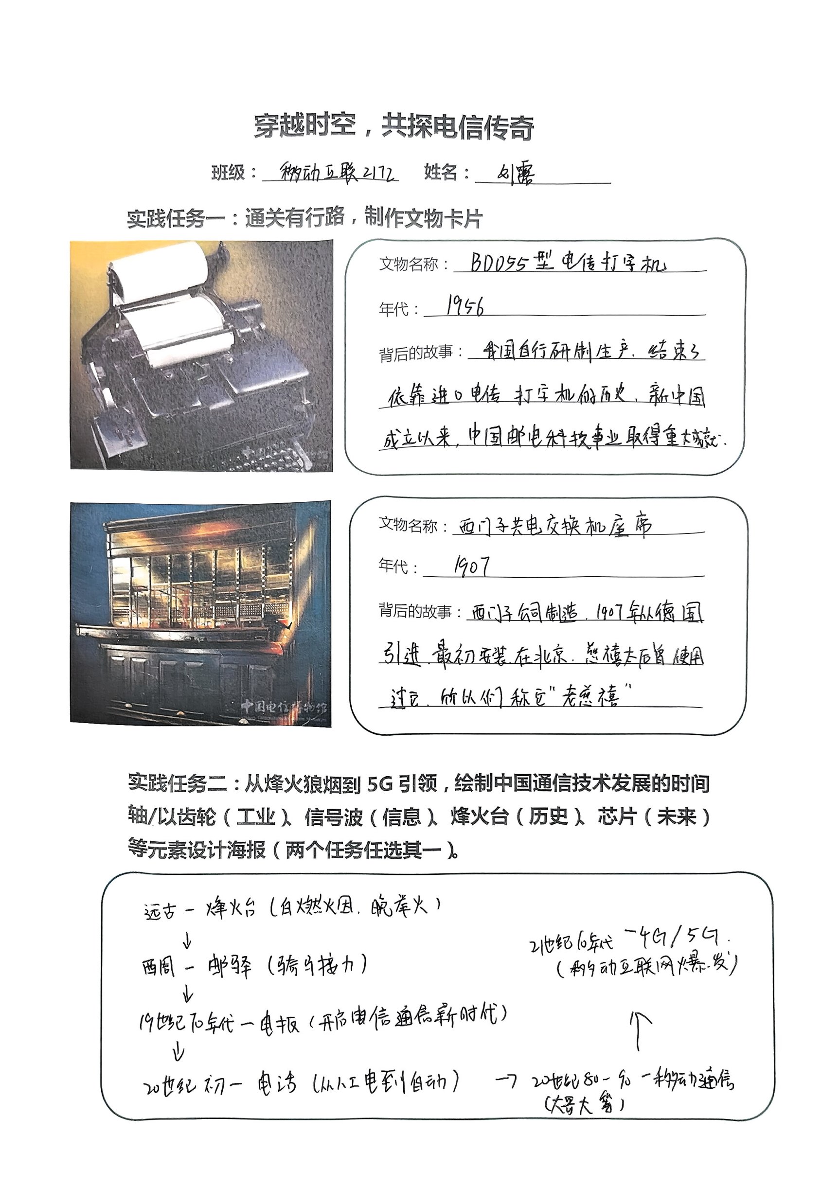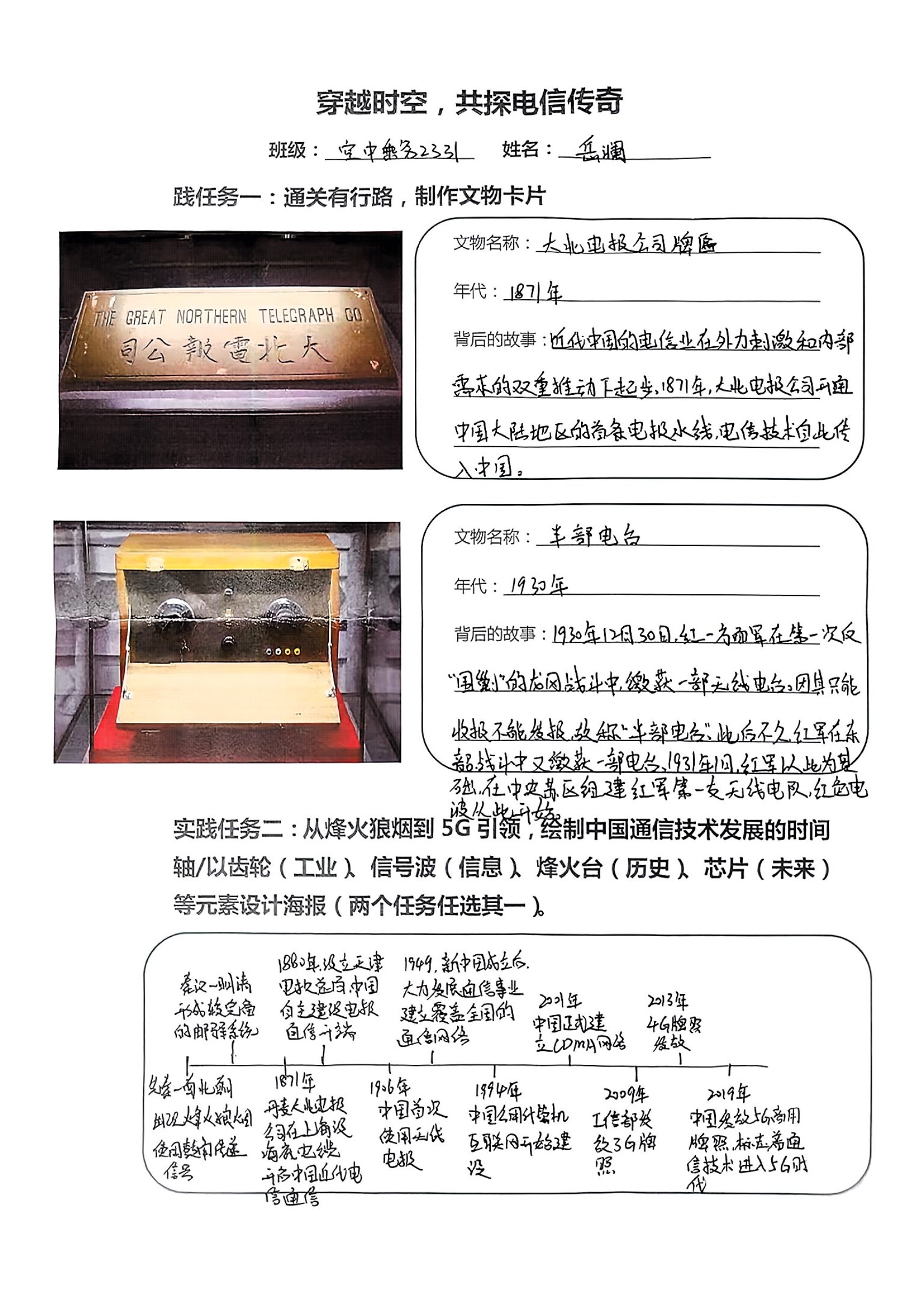 在前期充分調研與集體備課的基礎上,馬院老師精心設計了以 “穿越時空,共探電信傳奇”為主題的實踐手冊。手冊中設置了“通關有行路,制作文物卡片”“繪制中國通信技術發展時間軸”“以齒輪、信息波、烽火臺、芯片等元素設計海報”等任務,引導同學們在觀展中體會電信魅力。