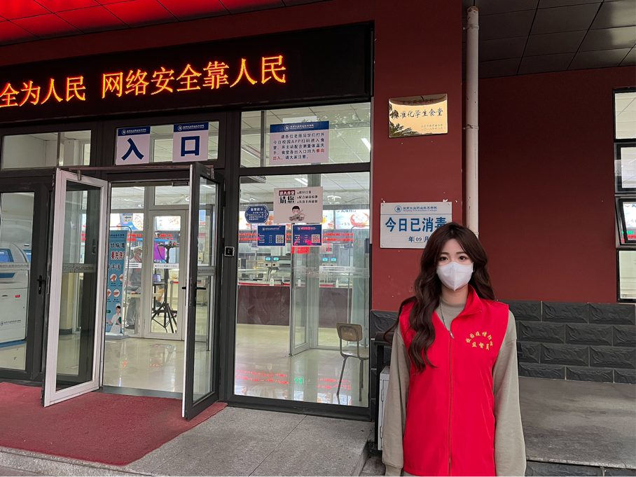 戴好口罩,穿上紅色馬甲,胸前掛著工牌,手上握著喇叭,從早上7:30到晚上22:00,“紅馬甲”的身影出現在食堂、體育館、圖書館、公寓和各教學樓宇。“同學你好,請戴好口罩,做好防護。”“老師您好,疫情期間請戴好口罩,注意防護。”在校園人流密集的地方常常可以聽到這樣溫馨的對話。