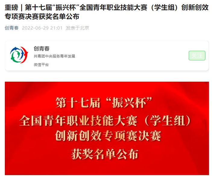 2022年6月27日至28日,由共青團中央、人力資源社會保障部主辦的第十七屆“振興杯”全國青年職業技能大賽(學生組)創新創效專項賽決賽圓滿落下帷幕。共有來自全國25個省份的187件作品入圍。經過激烈角逐,由我校團委組織推薦,機電工程學院教師李林琛、郭菾指導,王旭亮、叢浩然、管騰飛、水恒澤、姚鑫童、馬明宇六名選手的參賽作品《“飛檐走壁蜘蛛俠”——超級爬壁機器人》榮獲高職組創意設計類銀獎,這是我校首次在該項賽事上取得佳績,也是北京代表隊參賽院校中取得的最好成績。