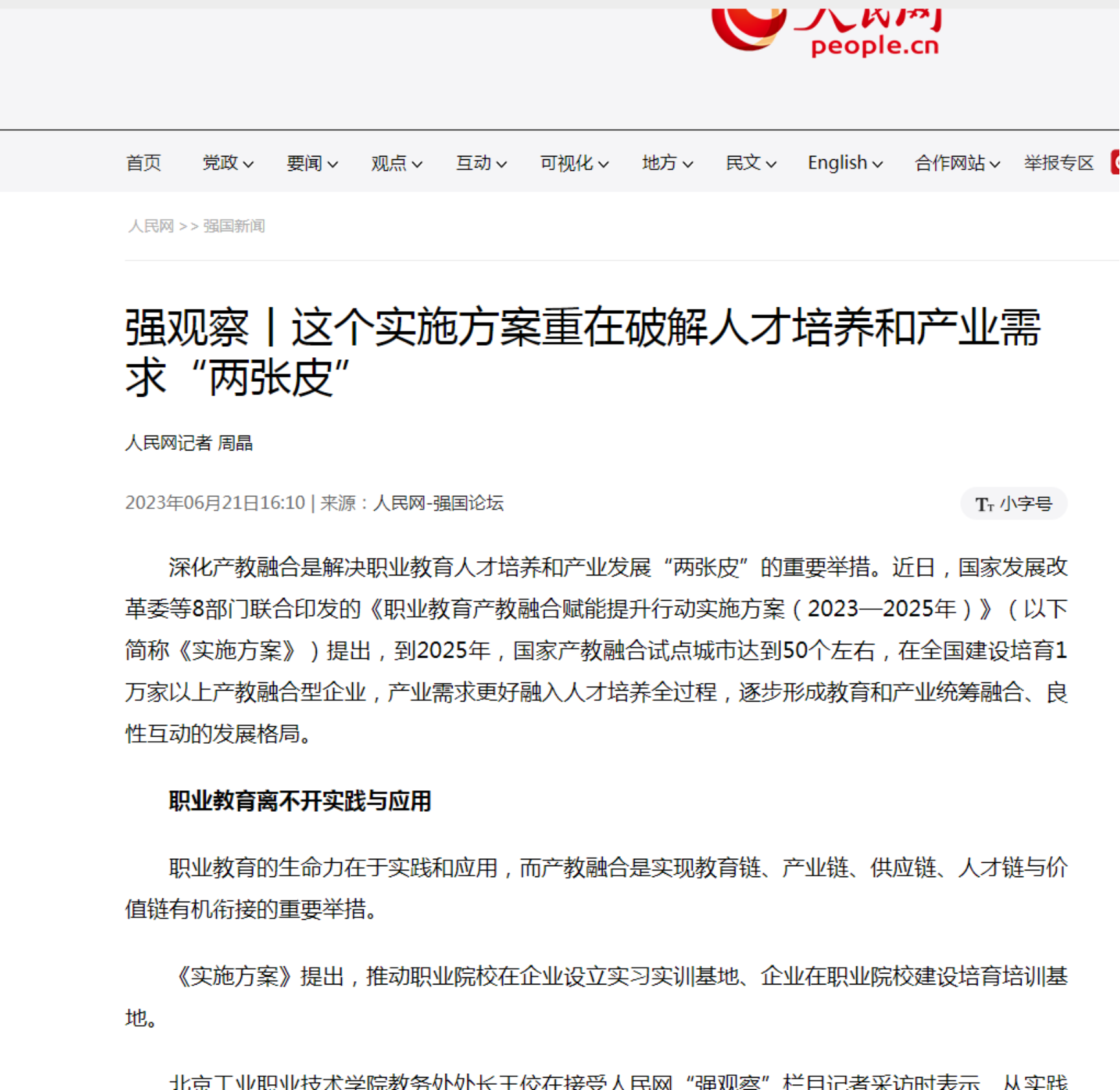近日,國家發展改革委等8部門聯合印發的《職業教育產教融合賦能提升行動實施方案(2023—2025年)》(以下簡稱《實施方案》)提出,到2025年,國家產教融合試點城市達到50個左右,在全國建設培育1萬家以上產教融合型企業,產業需求更好融入人才培養全過程,逐步形成教育和產業統籌融合、良性互動的發展格局。我校教務處處長王佼教授接受人民網“強觀察”欄目記者采訪,就這個實施方案重在破解人才培養和產業需求“兩張皮”的問題進行探討。