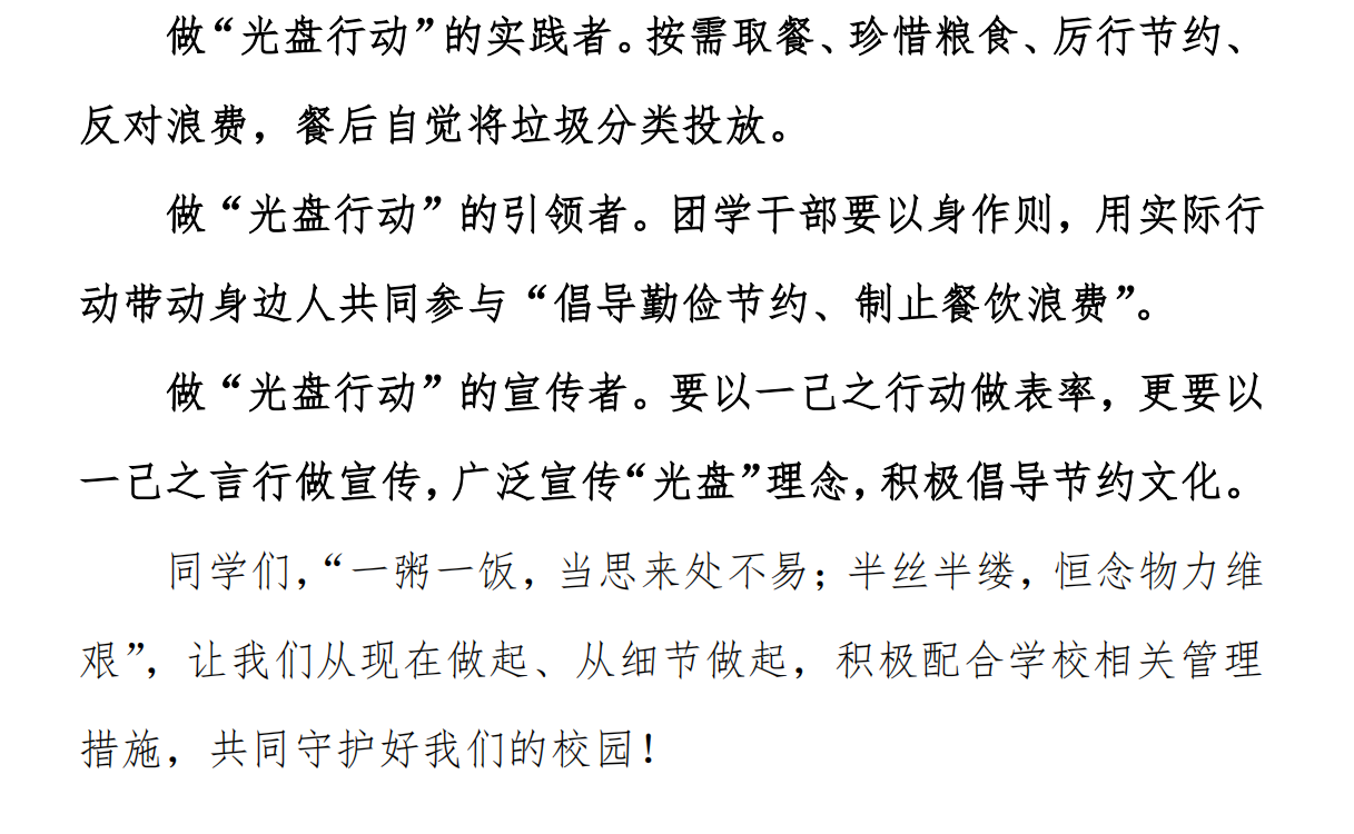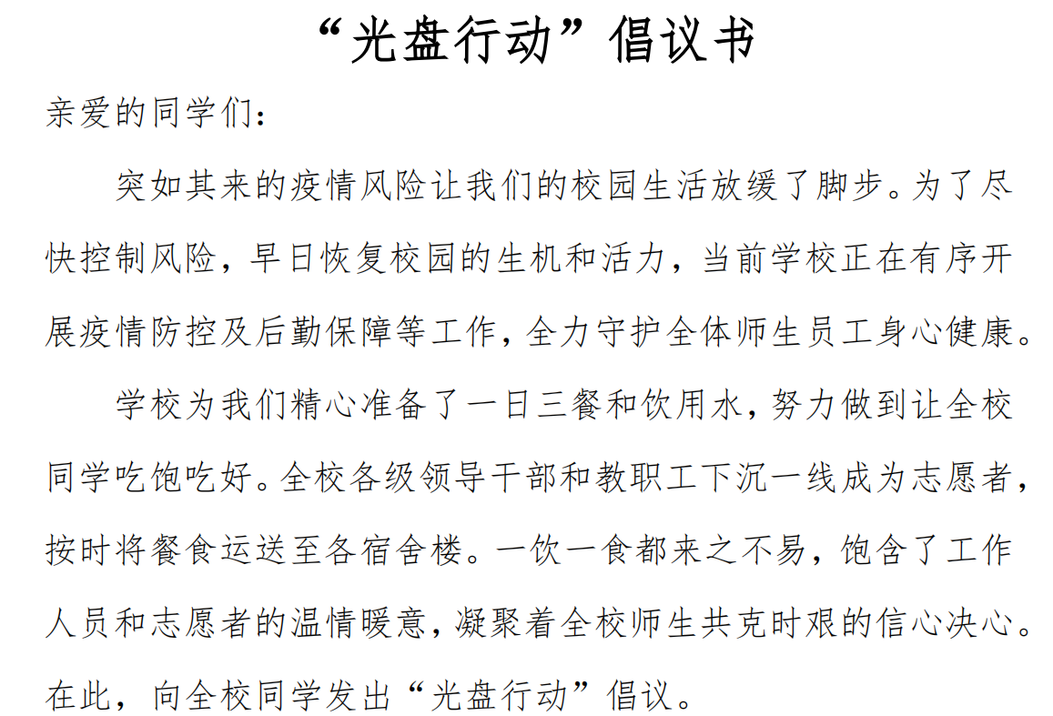 2022年11 月18日,學校進入臨時管控期,全校上下齊心協(xié)力共同努力抗擊疫情風險。為引導同學們積極配合學校管控措施,珍惜糧食、珍惜勞動,為疫情防控盡一份力量。校學生會向全體學生發(fā)出“光盤行動”倡議。