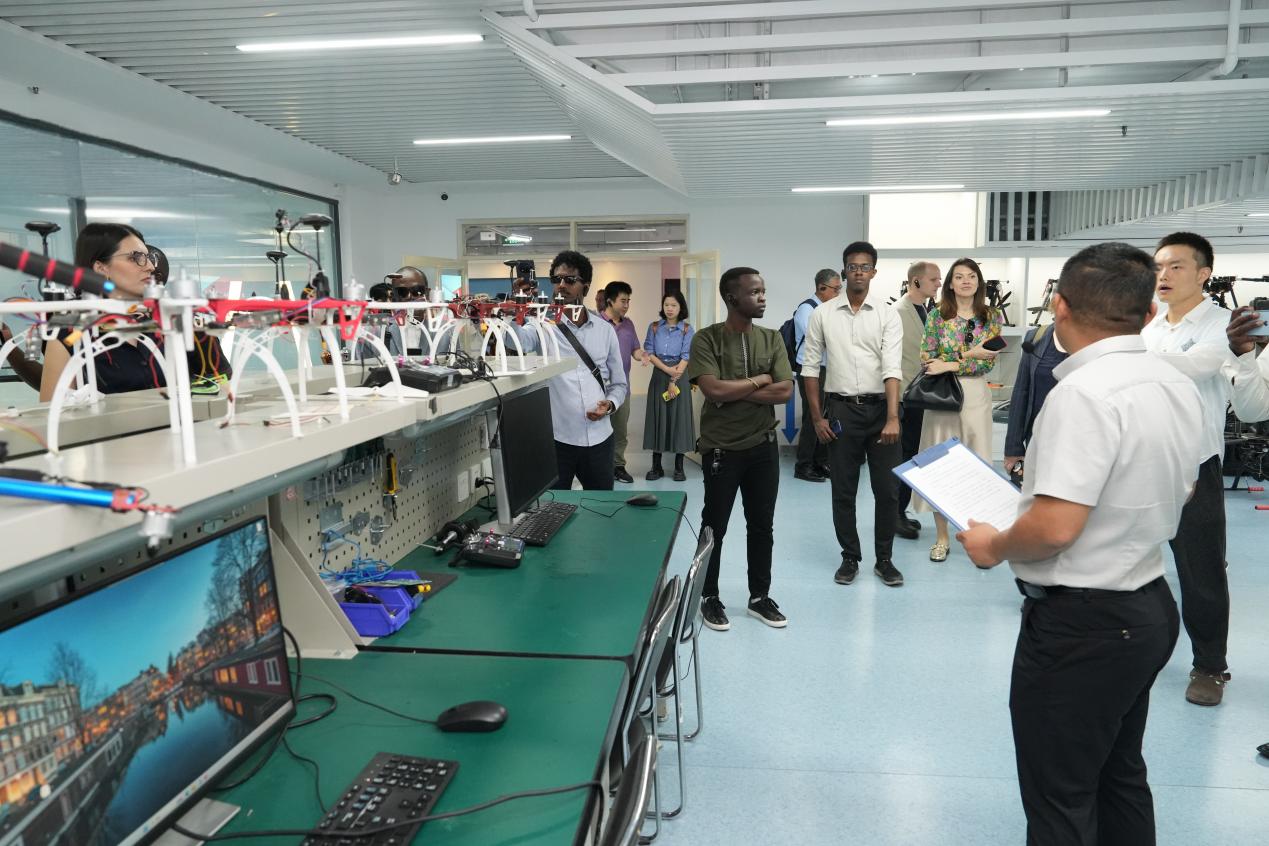 在高世吉的陪同下,記者團一行還參觀了我校施耐德中法能效管理應用人才培養和研究中心、汽車實訓中心、3D打印實訓中心、機器人實訓中心、城市空間信息北斗技術實訓中心、無人機測繪VR實訓中心、地形測量實訓中心等實訓室,對我校理實一體的教學模式、先進的實訓設備及優美的校園環境深表贊賞。肯尼亞記者布萊恩·恩古吉·恩吉羅格在參觀結束后,對目前中國的職業教育發展水平大加贊嘆,表示終于了解到中國成為“世界工廠”的一個非常重要的原因就是背后有中國職業教育為其提供的堅實人才支撐與教育基礎。