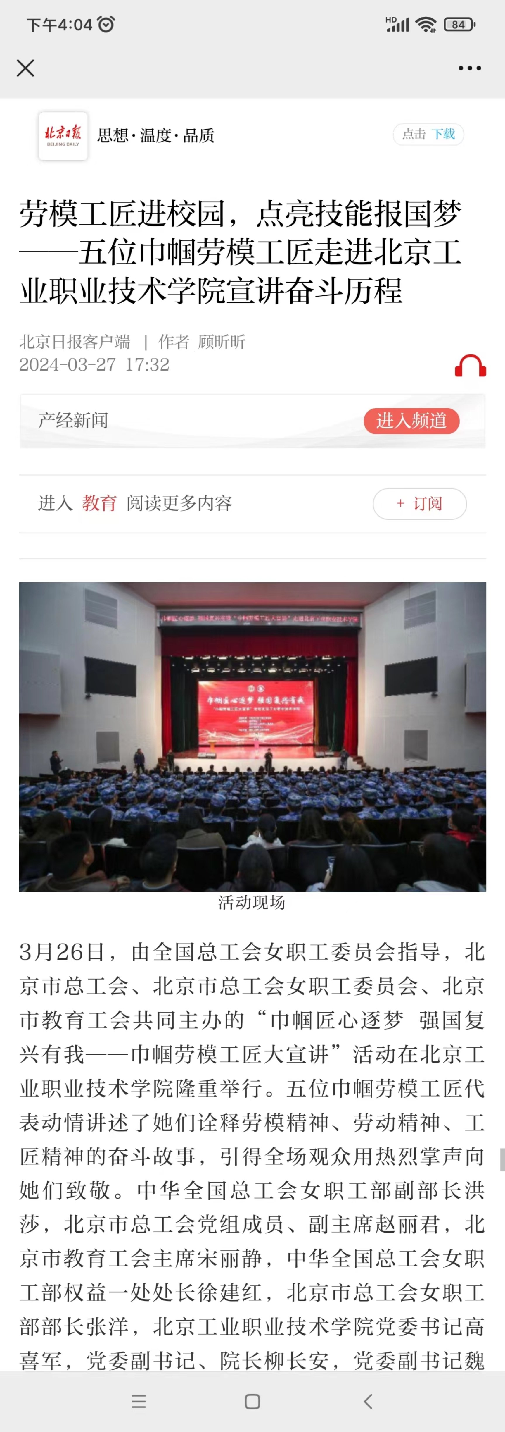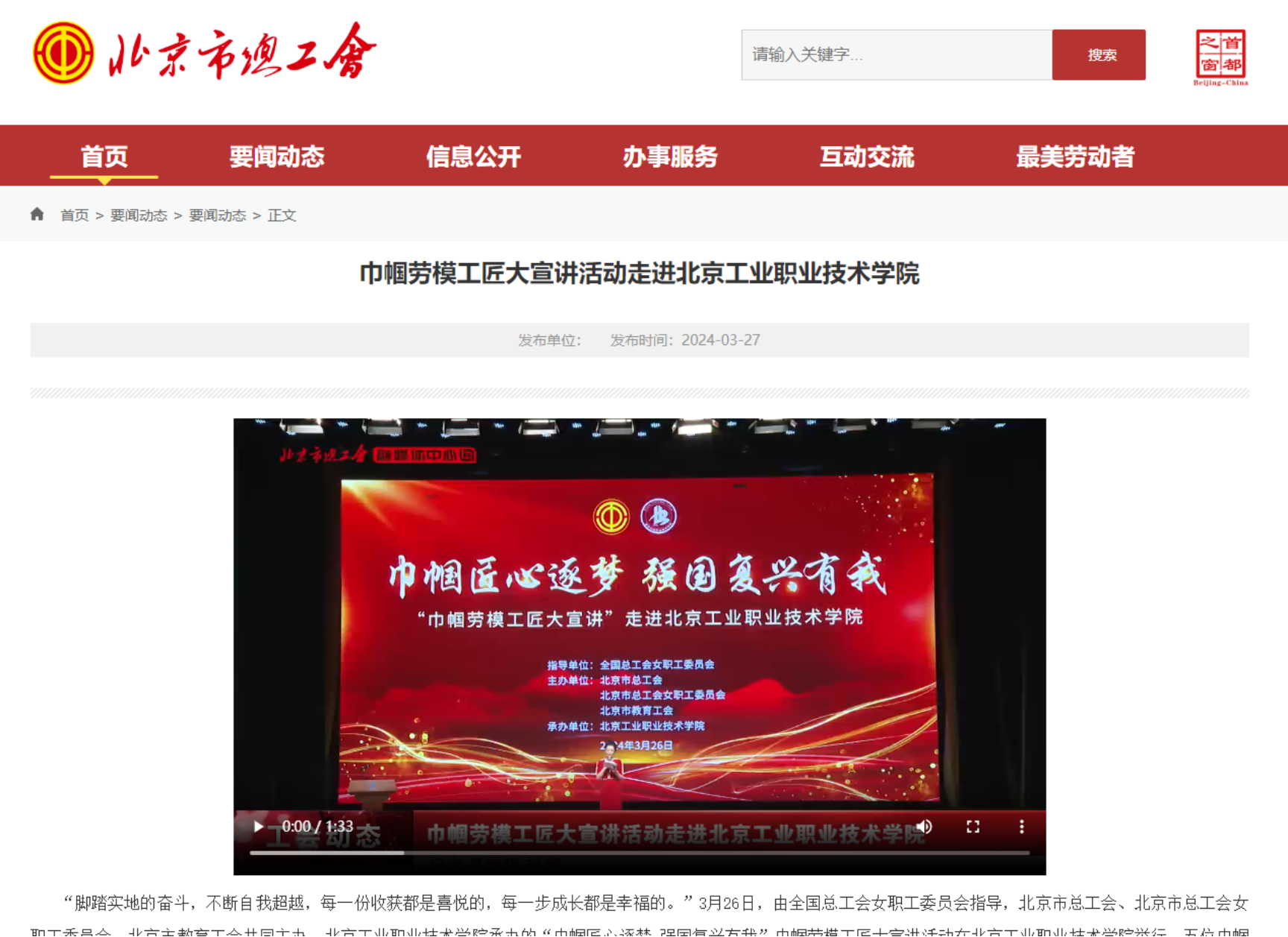 近日,“巾幗匠心逐夢 強國復興有我”巾幗勞模工匠大宣講活動在我校舉行,五位巾幗勞模工匠代表動情講述了她們詮釋勞模精神、勞動精神、工匠精神的奮斗故事,現場600名師生聆聽后用熱烈掌聲向她們表示致敬。《勞動午報》《北京日報》《現代教育報》等媒體紛紛關注報道,學習強國、中工網、今日頭條、北京市總工會官網、財經新聞網等進行了轉載。