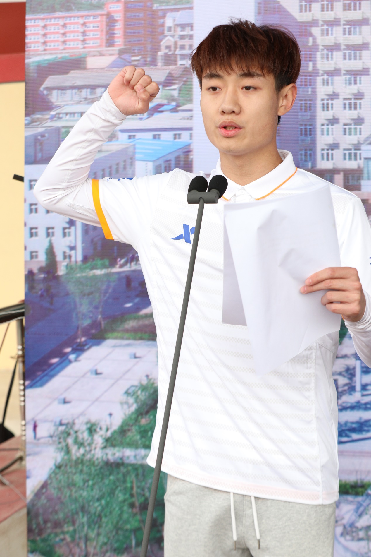 莊嚴的升旗儀式過后,校長安江英致開幕詞。他指出,在經(jīng)歷了極不平凡的2020年后,我國開啟了全面建設社會主義現(xiàn)代化國家新征程,迎來了中國共產(chǎn)黨建黨100周年,在這個重要而具歷史意義的年份里,經(jīng)過全校師生員工的精心組織與籌備,學校迎來了第四十三屆田徑運動會,向為籌備運動會付出辛勤勞動的教職員工和同學們表示衷心的感謝。