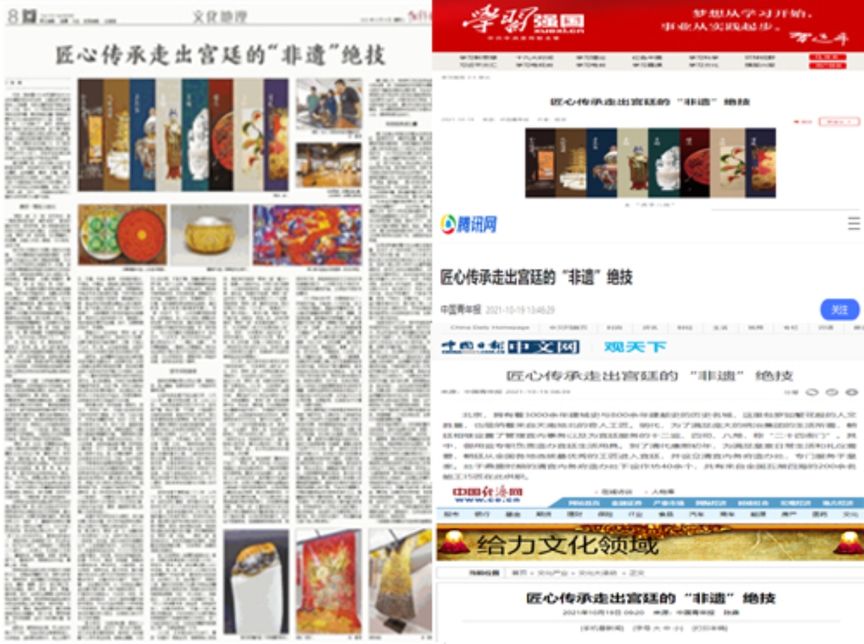2021年10月19日,《中國青年報》在第八版刊登題為《匠心傳承走出宮廷的“非遺”絕技》的采訪文章,介紹了已被列入國家級非物質文化遺產名錄的“燕京八絕”的傳承及發展情況。我校首飾設計與工藝專業大師工作室郭衛軍(首飾專業外聘教師)大師和首飾專業實訓室李嘉杰老師作為“燕京八絕”繼承和發展的代表性中青年力量之一在采訪中發表了自己的見解。