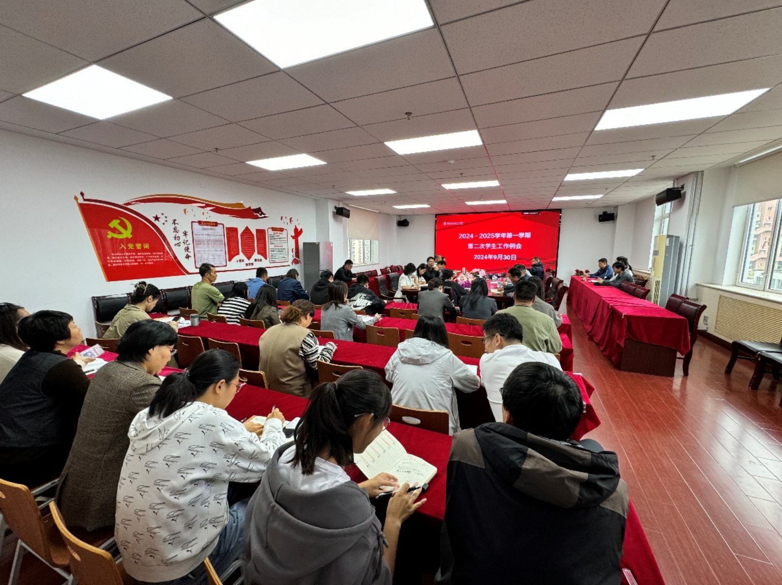 招生就業處尹燕功副處長布置了2024屆畢業生就業統計和2025屆畢業生就業推進工作。安穩處張軍副處長通報了開學一個月以來學生警情分析和安全事件處置情況。宣傳部胡軍偉副部長傳達了“健康心理活動宣傳”和“愛國奉獻擔當,強國復興有我”實施方案,并提出具體要求。校團委鄭興書記對2024年愛國主義教育月活動方案和學校共青團學習宣傳貫徹黨的二十屆三中全會精神相關工作安排。學生工作處副處長陳克清強調了學生公寓常見的涉及學生安全的幾種現象并提出了具體教育管理要求。學生工作處處長梁文學要求學生工作隊伍要深入到學生宿舍中去,重視開展線上和線下學生主題教育和一站式學生社區品牌建設,多措并舉夯實“基梁”計劃落實。